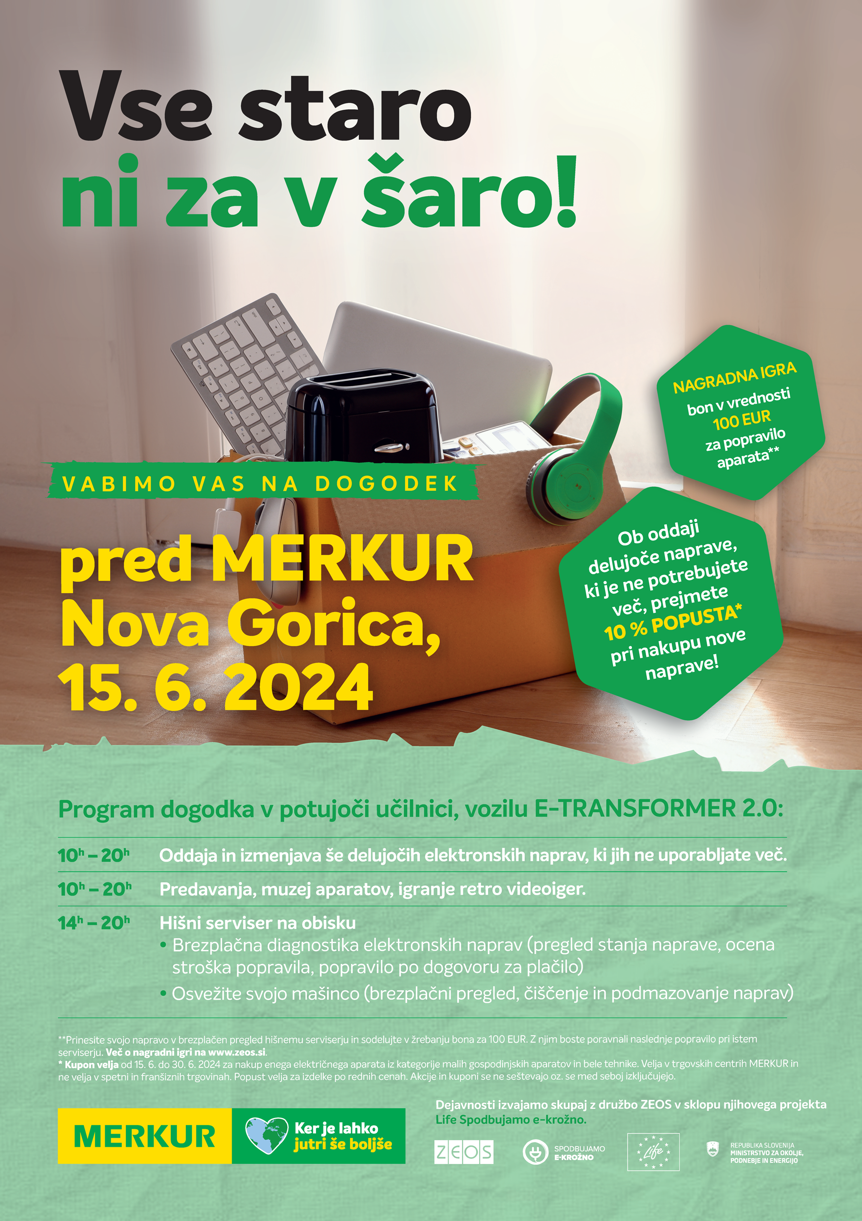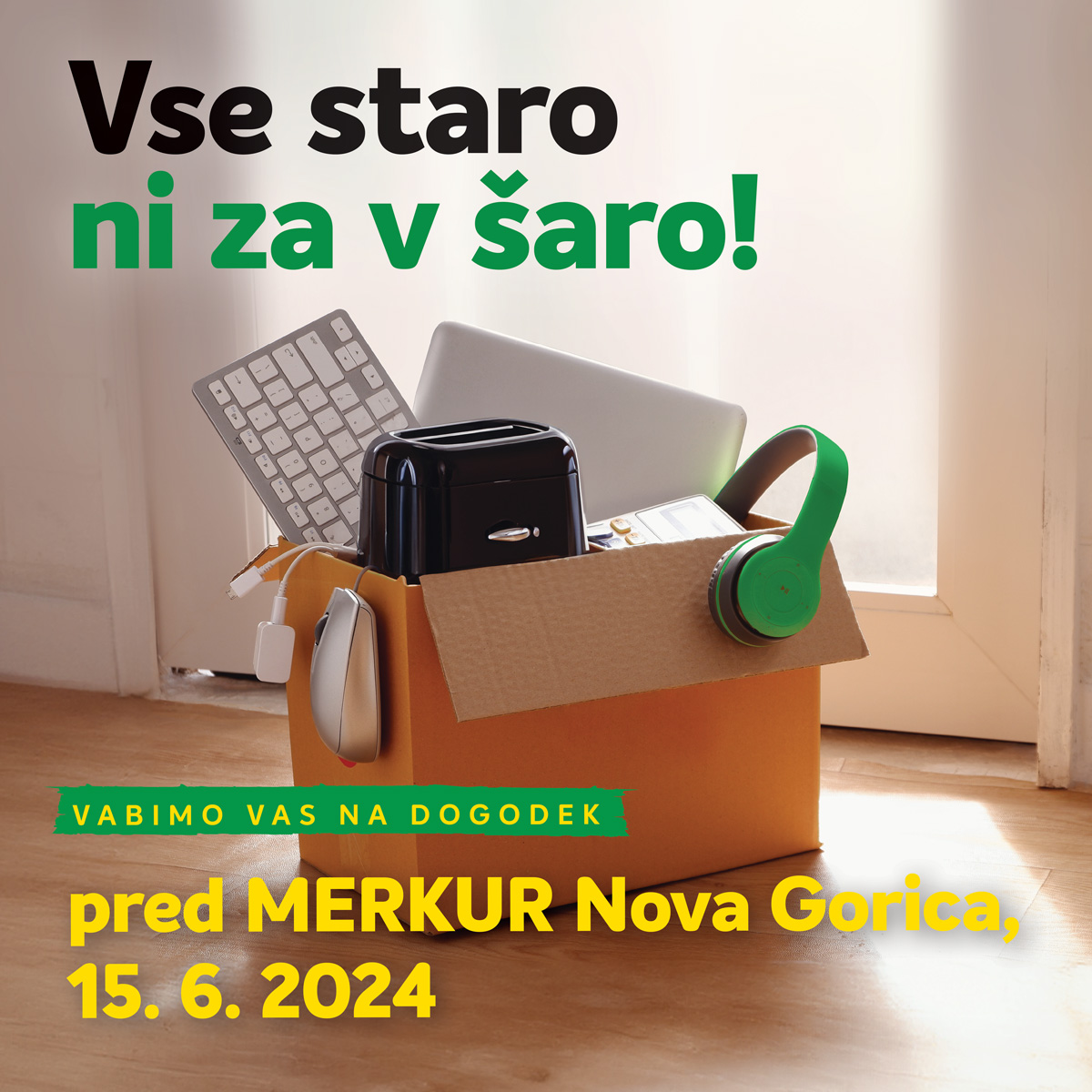 Poleg tega pa bomo v letu 2024 pred večjimi trgovskimi centri skupaj z družbo ZEOS in v sklopu njihovega projekta Life Spodbujamo e-krožno, organizirali dogodke »Vse staro ni za v šaro«, na katerih boste lahko oddali, menjali ali osvežili svoje še uporabne stare elektronske naprave in jim tako podaljšali življenjsko dobo!