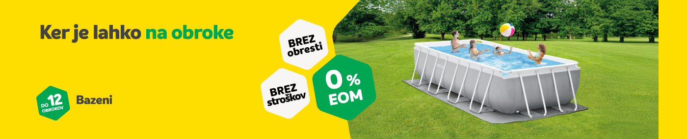 *V promocijskem obdobju, od 1. do 30. 6. 2025, za nakupe na 3, 6 in 12 obrokov za bazene; kupec NE plača obresti (0 %) in stroškov ocene rizika. Informativni izračun plačila na obroke NE vključuje stroškov dostave. Za nakupe nad 18, 24, 36 in 48 obrokov velja redna ponudba kredita Leanpay.