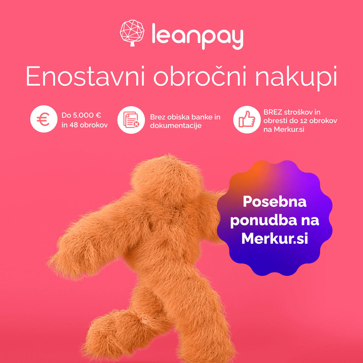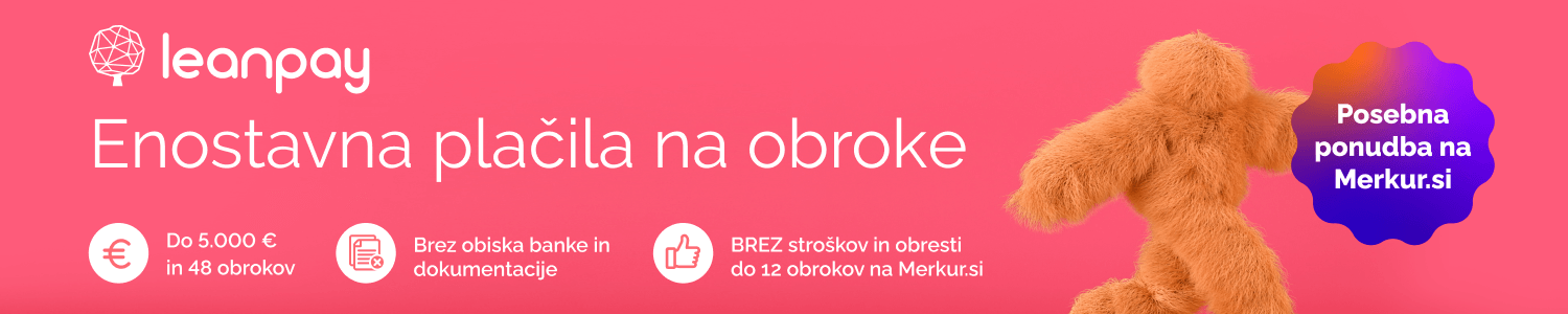 Izkoristi posebno promocijo! Od 5. do 15. 10. 2023 lahko v spletni trgovini merkur.si nakupuješ na do 12 obrokov z Leanpay BREZ stroškov in BREZ obresti. Vse kar potrebuješ, je mobilni telefon in osebni dokument. Ves postopek traja le nekaj minut.