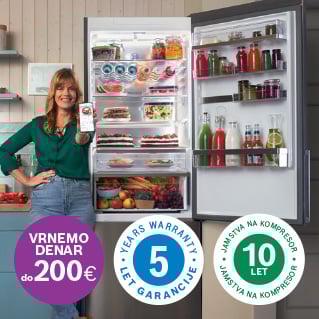 Če ste med 1. 4. 2026 in 30. 9. 2026 kupili izbrani pralni, sušilni, pralno-sušilni stroj, prostostoječi hladilnik z zamrzovalnikom ali zamrzovalnik Bosch, vam vrnemo od 70 € do 200 € (odvisno od modela).