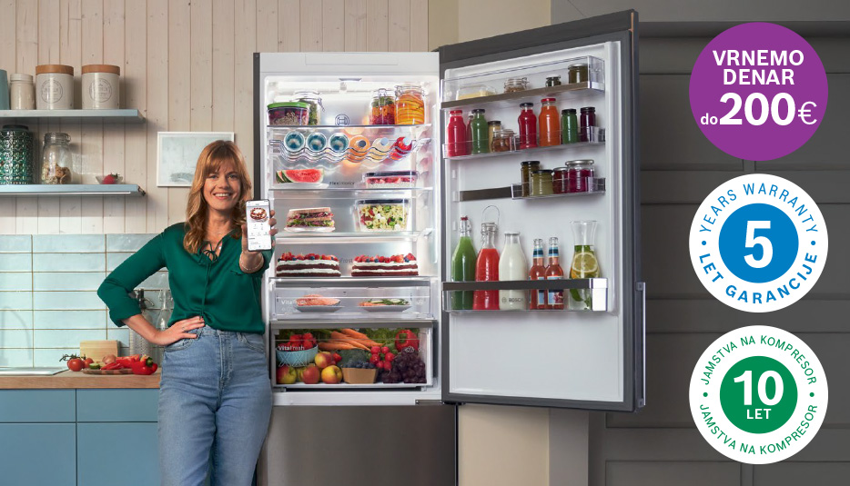 Če ste med 1. 4. 2026 in 30. 9. 2026 kupili veliki hišni aparat Bosch iz naslednjih kategorij: prostostoječi hladilniki in / ali prostostoječi zamrzovalniki, vam podarjamo dodatna 3 leta garancije.