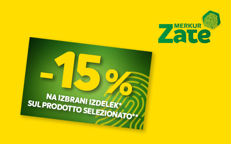 Člani programa zvestobe MERKUR Zate lahko od 11. do 30. 4. 2026 uveljavite 15 % popust na en izdelek po vaši izbiri*. Popust se obračuna na blagajni po skeniranju ID številke člana MERKUR Zate.