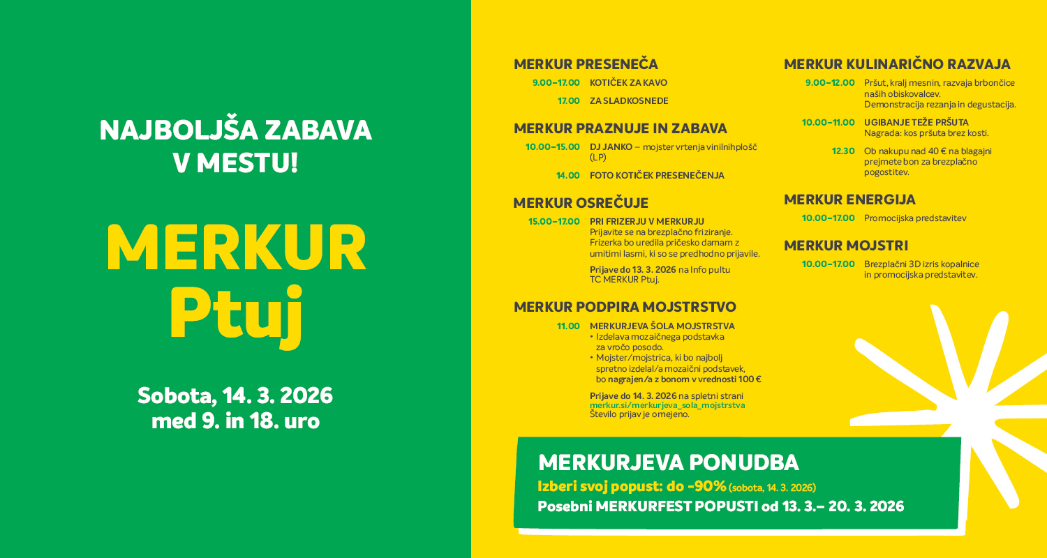 Sobota, 14. 3. 2026 med 9. in 18. uro MERKUR Ptuj