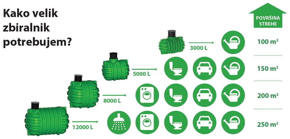 Katera velikost zbiralnika deževnice je ustrezna, vam bodo najbolje svetovali ROTO strokovnjaki. Pripravite odgovore na 3 ključna vprašanja, na podlagi katerih vam bodo svetovalci pomagali izbrati velikost in tip zbiralnika ter ustrezno opremo:
