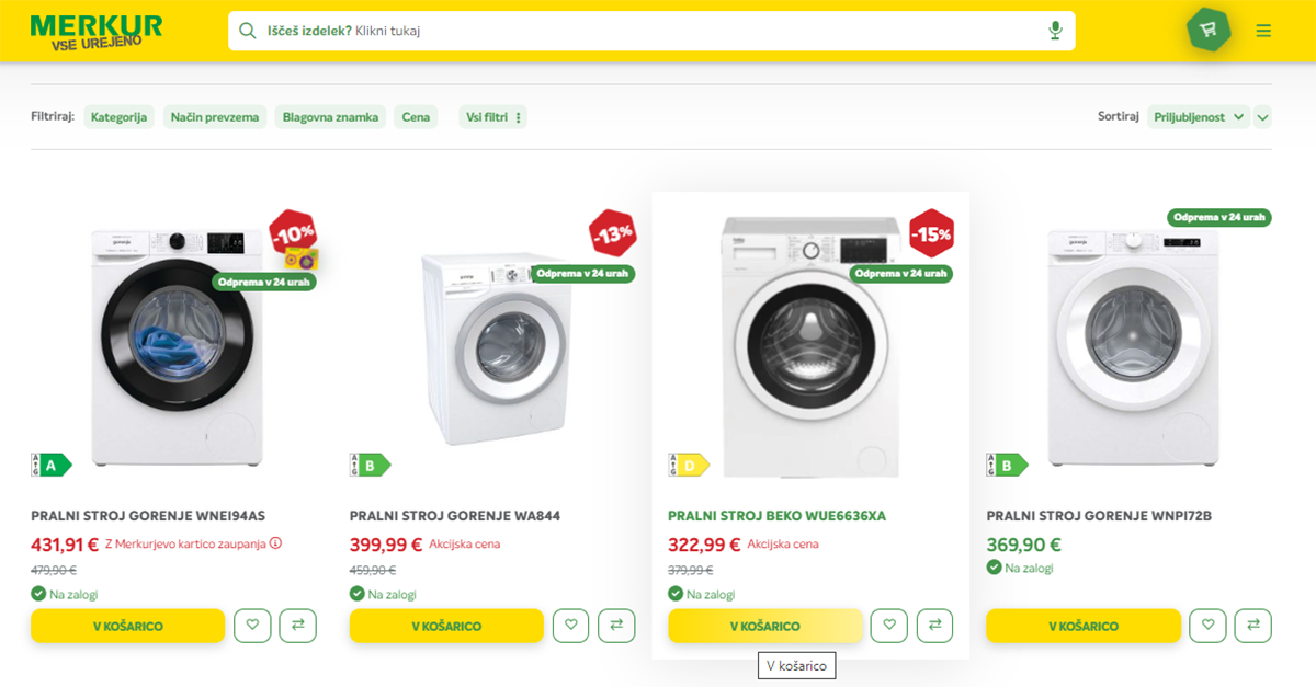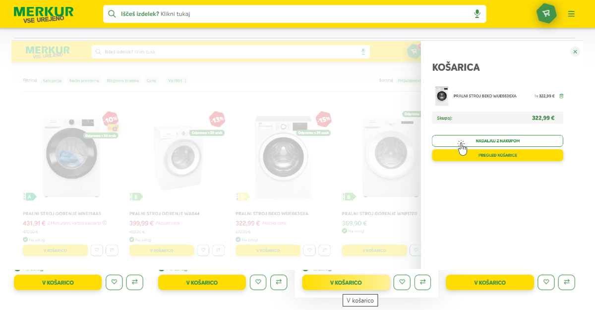 • V Spletnem centru Merkur s klikom na gumb "Dodaj v košarico", izberite želene izdelke. Po zaključku izbora kliknite na ikono nakupovalnega vozička ter se odpravite v nakupovalno košarico.
