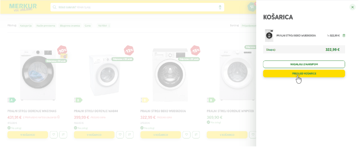 • Za pregled izdelkov, ki ste jih dodali v košarico, v desnem zgornjem obvestilu izberite možnost »PREGLED KOŠARICE«.