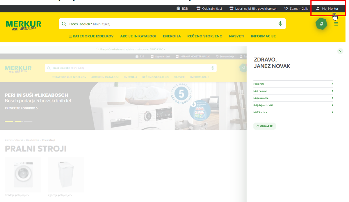 • V kolikor ste registriran in prijavljeni kot uporabnik »Moj Merkur«, lahko v spustnem meniju izbirate med dodatnimi nastavitvami (Moj profil, Moji naslovi, Moja naročila, Priljubljeni izdelki, MKZ kartica in Odjava).