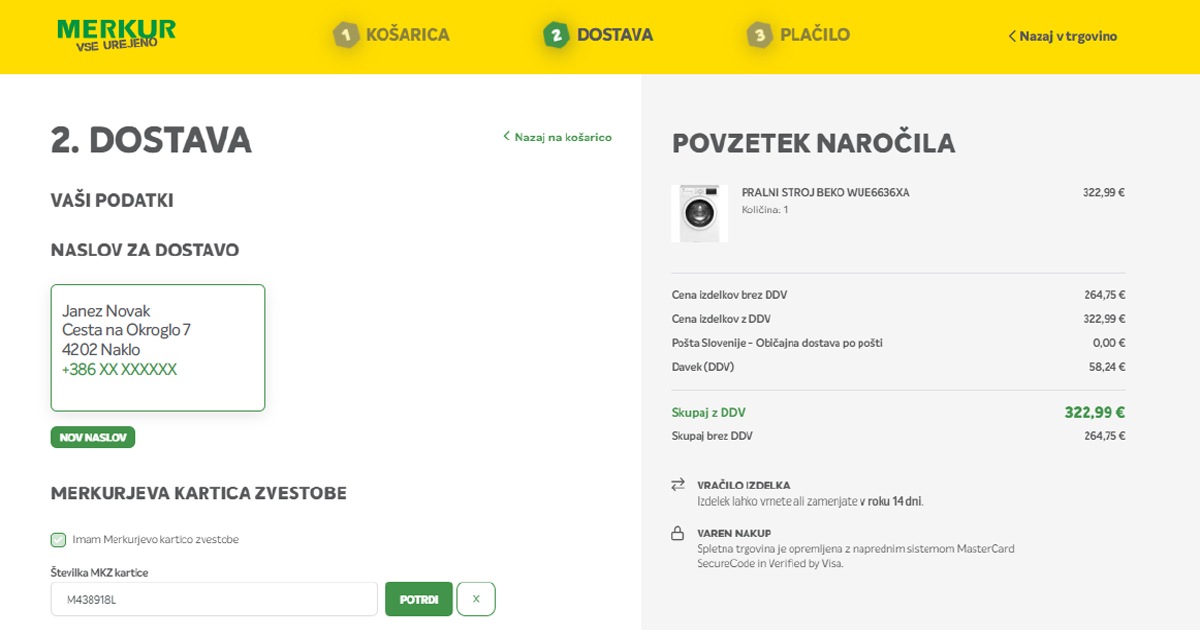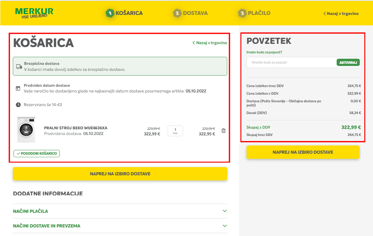 • S klikom na gumb »NAPREJ NA IZBIRO DOSTAVE« vas vodi na naslednji korak »Dostava«.