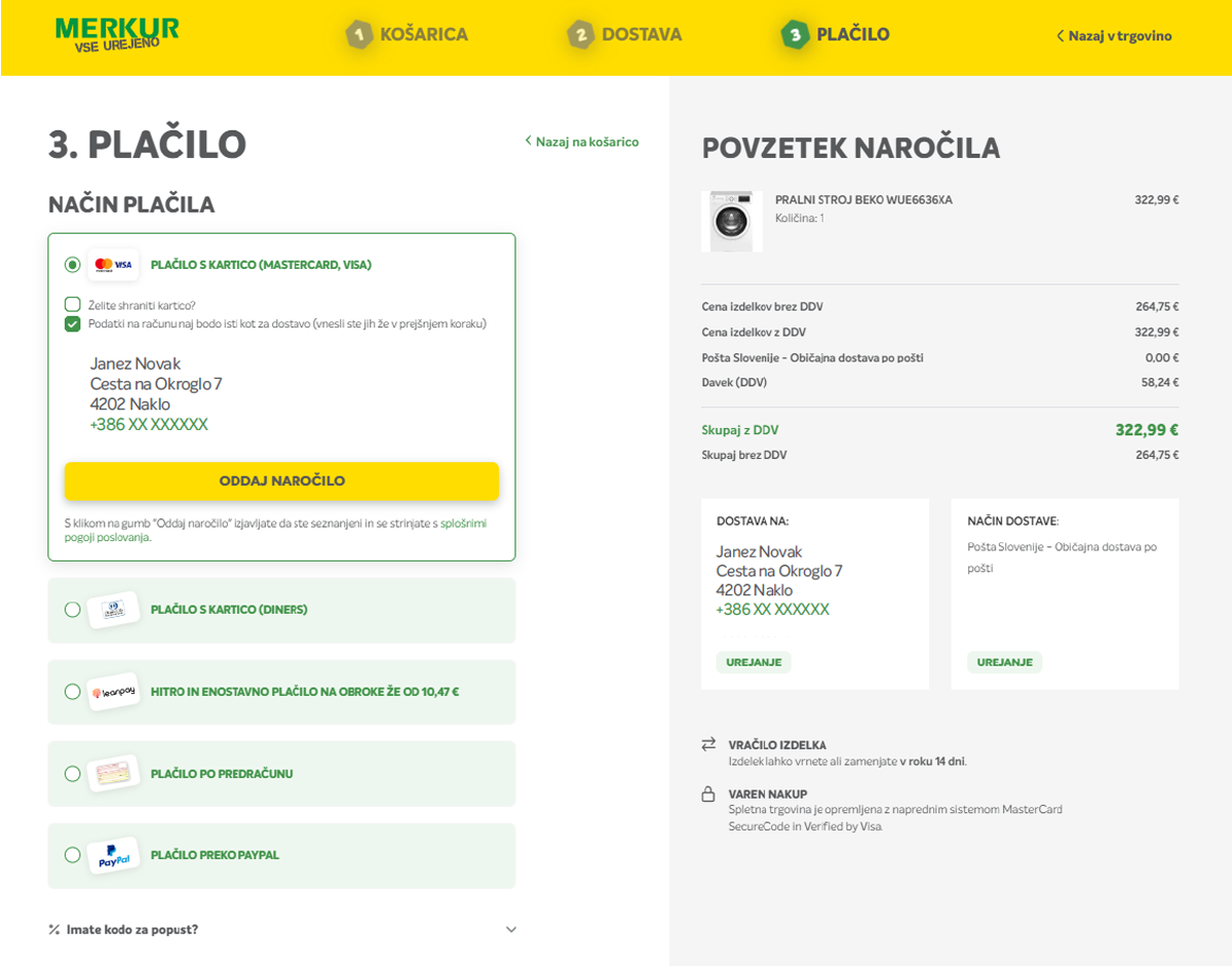 • S klikom na gumb »NAPREJ NA IZBIRO PLAČILA« vas vodi na naslednji korak »PLAČILO«.