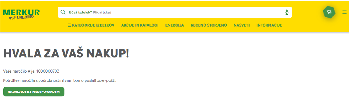 • Po oddaji naročila se prikaže okno »HVALA ZA VAŠ NAKUP!«. Uporabnik oz. kupec po elektronski pošti prejme obvestilo, da je naročilo sprejeto v Spletni center Merkur. Prav tako prejme SMS sporočilo.
