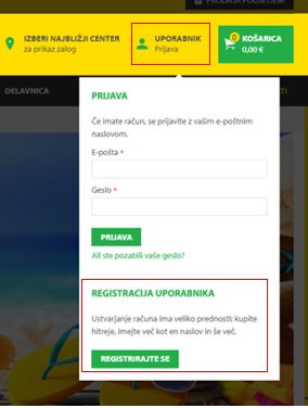 Nakup v spletni trgovini lahko opravite kot gost ali kot registriran uporabnik. Če se želite registrirati, se ob košarici v desnem zgornjem kotu postavite z miško na polje »UPORABNIK«, kjer se vam pojavi spodnje okno. Kliknete na gumb »REGISTRIRAJTE SE«.