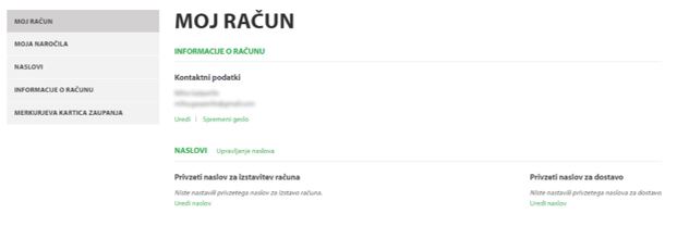 Kot registriran in prijavljen uporabnik imate vpogled v svoj račun, kjer lahko vpogled v svoj račun, naročila, naslove, informacije računu ter Merkurjevi kartici zaupanja.