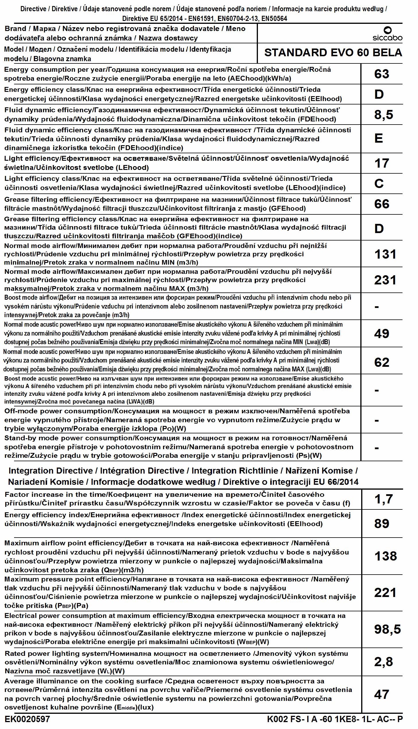 Blagovna znamka SICCABO ENERGIJSKI RAZRED D VRSTA NAPE PODVGRADNA UPRAVLJANJE MEHANSKO LETNA PORABA ENERGIJE 63 KWH RAZRED UČINKOV. PRETOKA ZRAKA E PRETOK ZRAKA DO 231 M3/H RAZRED UČINKOV. OSVETLJEVANJA C GLASNOST DELOVANJA 62 DB RAZRED UČINKOV. FILTR. MAŠČOB D ŠIRINA 60 CM BARVA BELA GARANCIJA V LETIH 5 Mnenja