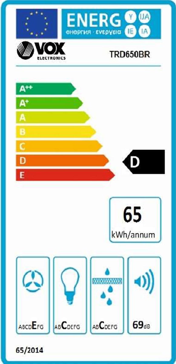 Vox Electronics TRD 650 BR je zmogljiva kuhinjska napa modernega dizajna. Omogoča pretok zraka do 208 m3/h in deluje z glasnostjo 69 dB. Uvršča se v energijski razred D. Za dobro osvetlitev površine bo poskrbela LED osvetlitev. 3 hitrosti delovanja bodo poskrbele za odlične rezultate.
