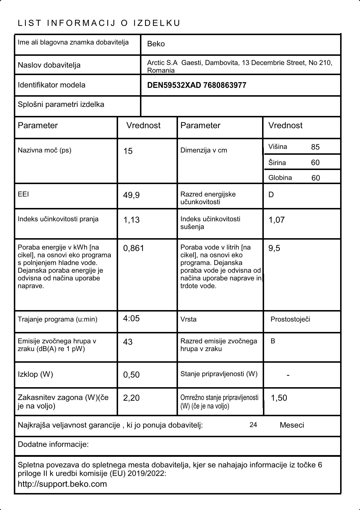 Blagovna znamka BEKO VRSTA POMIVALNEGA STROJA PROSTOSTOJEČI BARVA SREBRNA ŠTEVILO POGRINJKOV 15 ŠIRINA 59,8 CM PORABA ENERGIJE NA 100 CIKLOV 86 KWH VIŠINA 85 CM ŠTEVILO PROGRAMOV 9 GLOBINA 60 CM PORABA VODE NA CIKEL 9.5 L ZAŠČITA PRED IZLIVOM VODE DA INVERTER MOTOR DA ZAMIK VKLOPA DA ŠTEVILO TEMPERATUR 6 POVEZLJIVOST WI-FI NE ENERGIJSKI RAZRED D TRAJANJE PROGRAMA ECO 4:05 H : MIN ŠIRINA POMIVALNEGA STROJA 60 CM EMISIJA HRUPA 43 DB RAZRED EMISIJE HRUPA B GARANCIJA V LETIH 2 LETI - Mnenja