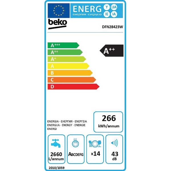 Prostostoječi pomivalni stroj priznanega proizvajalca Beko je naprava z nizko letno porabo električne energije 266 kWh. Spada v visok energijski razred A++ in uporabniku omogoča visok prihranek pri električni energiji in vodi. Uporabniku omogoča kar 8 različnih programov pomivanja ter 6 temperaturnih območij za resnično prilagojeno pomivanje vaše posode. Zagotavlja pomivanje do kar 14 standardnih pogrinjkov ter zamik pričetka vklopa programa. Ima pokazatelj preostalega časa pomivanja, po višini nastavljivo zgornjo košaro ter zaščito proti izlivanju vode.