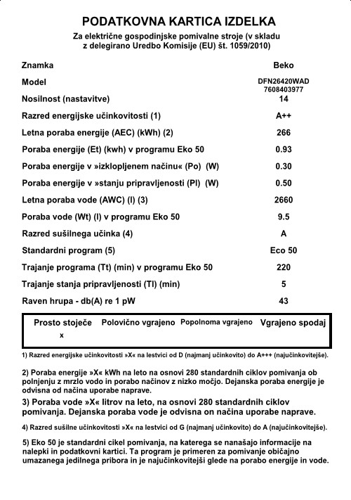 Blagovna znamka BEKO VRSTA POMIVALNEGA STROJA PROSTOSTOJEČI ŠTEVILO POGRINJKOV 14 PORABA ENERGIJE NA 100 CIKLOV 95 KWH GLASNOST DO 43 DB ŠTEVILO PROGRAMOV 6 ŠIRINA 59,8 CM PORABA VODE NA CIKEL 9,5 L VIŠINA 85 CM GLOBINA 60 CM ZAŠČITA PRED IZLIVOM VODE WATERSAFE BARVA BELA POVEZLJIVOST WI-FI NE INVERTER MOTOR DA ŠTEVILO TEMPERATUR 5 ZAMIK VKLOPA DA TRAJANJE PROGRAMA ECO 3:40 H : MIN ENERGIJSKI RAZRED E ŠIRINA POMIVALNEGA STROJA 60 CM EMISIJA HRUPA 43 DB RAZRED EMISIJE HRUPA B DODATNO - POMIVALNI STROJ HITRI PROGRAM LED PRIKAZ ZA DOZIRANJE SOLI LED PRI GARANCIJA V LETIH 2 LETI -