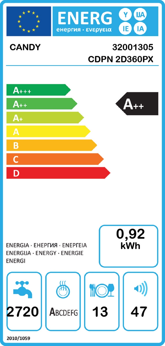 Candy prostostoječi pomivalni stroj CDPN 2D 360 PX ima zmogljivost 13 pogrinjkov in sodi v A++ energijski razred z glasnostjo delovanja 47 decibelov. Poleg 9 različnih programov, ima pomivalni stroj tudi možnost zamika vklopa in dodatnega upravljanja preko aplikacije za pametne telefone.
