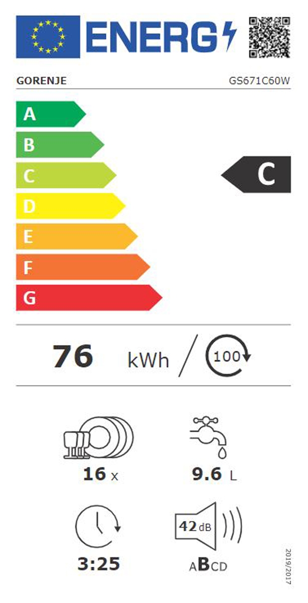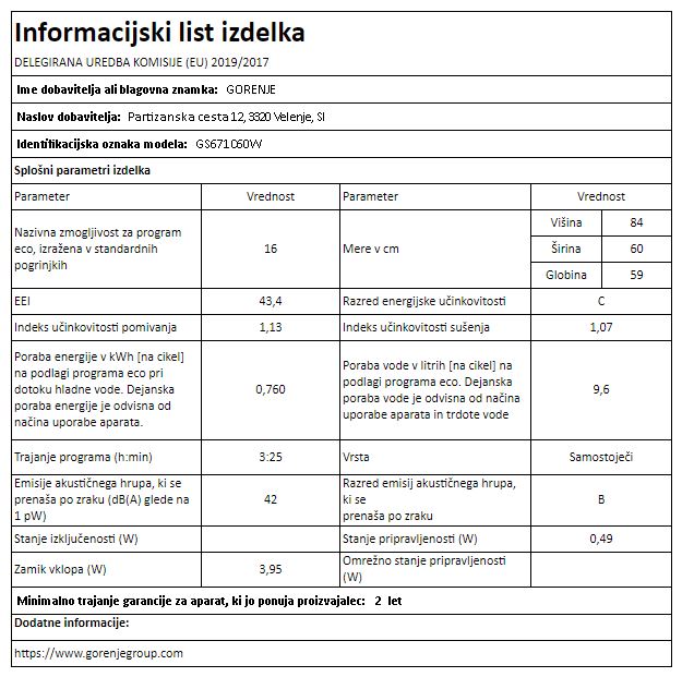 Blagovna znamka GORENJE ENERGIJSKI RAZRED C VRSTA POMIVALNEGA STROJA PROSTOSTOJEČI ŠTEVILO POGRINJKOV 16 PORABA ENERGIJE NA 100 CIKLOV 76 KWH ŠTEVILO PROGRAMOV 5 PORABA VODE NA CIKEL 9,6 L ŠIRINA 60 CM ZAŠČITA PRED IZLIVOM VODE AQUA STOP GLOBINA 60 CM INVERTER MOTOR DA ŠTEVILO TEMPERATUR 5 TRAJANJE PROGRAMA ECO 205 H : MIN ŠIRINA POMIVALNEGA STROJA 60 CM EMISIJA HRUPA 42 DB RAZRED EMISIJE HRUPA B ZAMIK VKLOPA DA POVEZLJIVOST WI-FI NE VIŠINA 84,8 CM GARANCIJA V LETIH 5 Mnenja