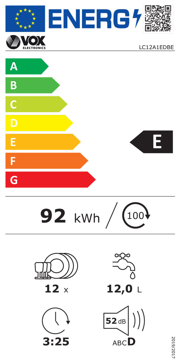 Pomivalni stroj Vox Electronics LC 12A1EDB E spada v energijski razred E. Ponaša se s kapaciteto 12 pogrinjkov in šestimi programi čiščenja pri štirih različnih nastavitvah temperature.