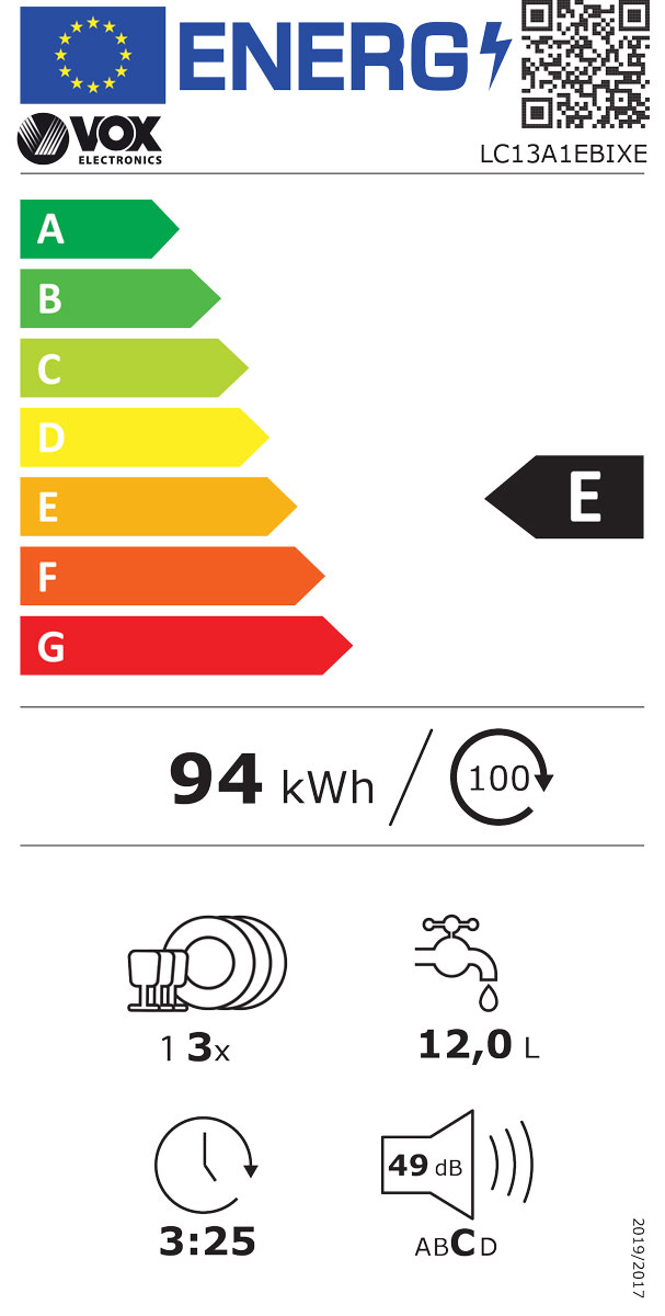 Praktični VOX pomivalni stroj LC 13A1E-BIX E je primeren za pranje 13 standardnih pogrinjkov, ki jih očisti s 6 različnimi programi.Spada v energijski razred E.