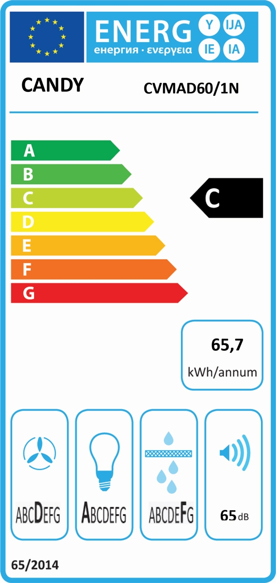 Blagovna znamka CANDY LETNA PORABA ENERGIJE 65,7 KWH UPRAVLJANJE MEHANSKO RAZRED UČINKOV. PRETOKA ZRAKA D ŠIRINA 60 CM RAZRED UČINKOV. OSVETLJEVANJA A VRSTA NAPE STENSKA RAZRED UČINKOV. FILTR. MAŠČOB F PRETOK ZRAKA DO 463,3 M3/H GLASNOST DELOVANJA 65 DB BARVA ČRNA ENERGIJSKI RAZRED C GARANCIJA V LETIH 2 LETI -