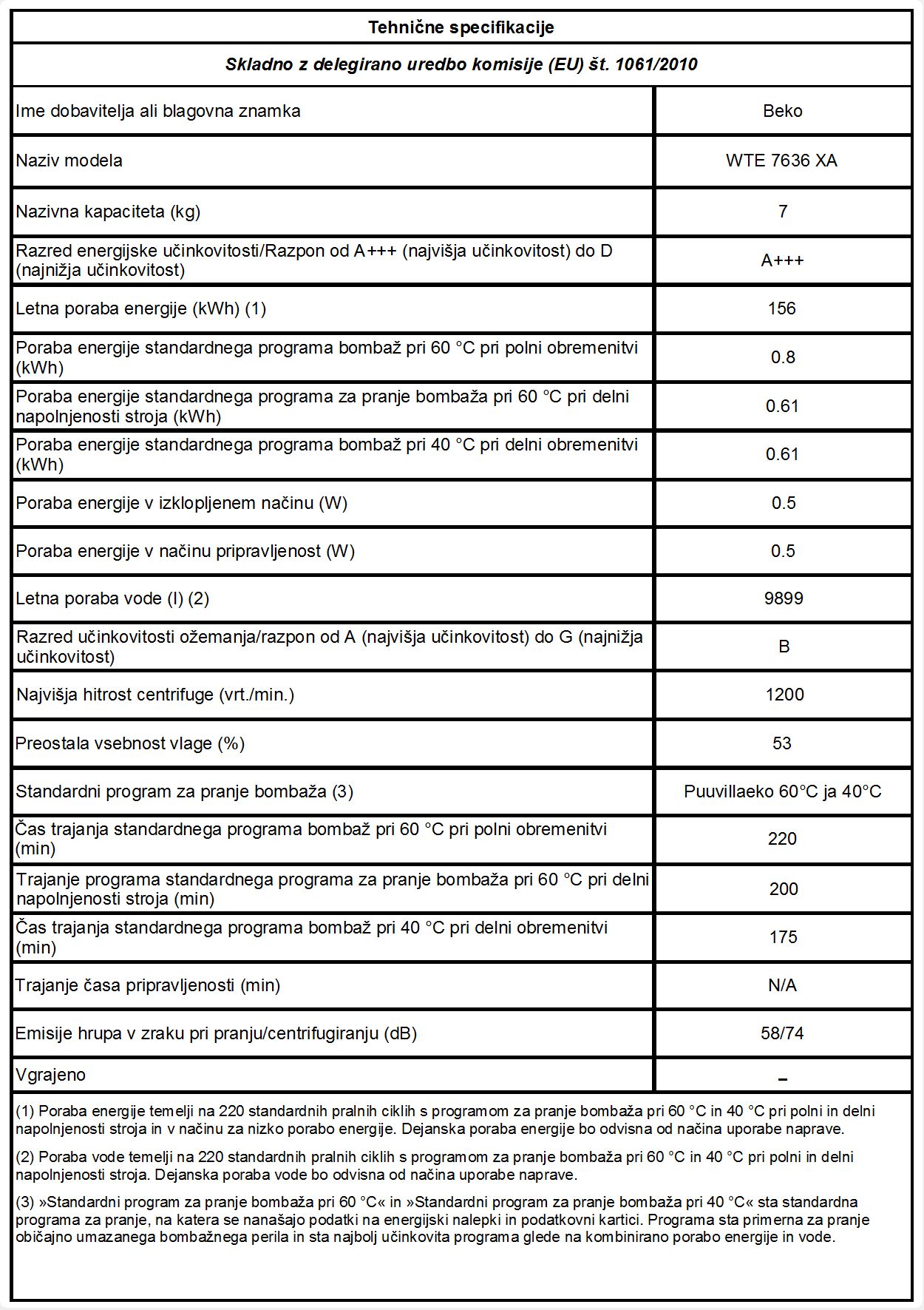 Blagovna znamka BEKO VRSTA PRALNEGA STROJA POLNJENJE SPREDAJ ZMOGLJIVOST PRANJA 7 KG UPRAVLJANJE ELEKTRONSKO ŠIRINA 60 CM VIŠINA 84 CM UČINEK OŽEMANJA B GLOBINA 49 CM LETNA PORABA EL.EN./220 CIKLOV 156 KWH LETNA PORABA VODE / 220 CIKLOV 9899 L HITROST OŽEMANJA DO 1200 O/MIN POVEZLJIVOST WI-FI DA INVERTER MOTOR DA ZAMIK VKLOPA DA ENERGIJSKI RAZRED A+++ PARNA TEHNOLOGIJA DA GLASNOST PRANJA 58 DB GLASNOST OŽEMANJA 74 DB GLOBINA DO 50 CM DA PRIMEREN ZA ALERGIKE DA AQUASTOP TEHNOLOGIJA NE GARANCIJA V LETIH 2 LETI -