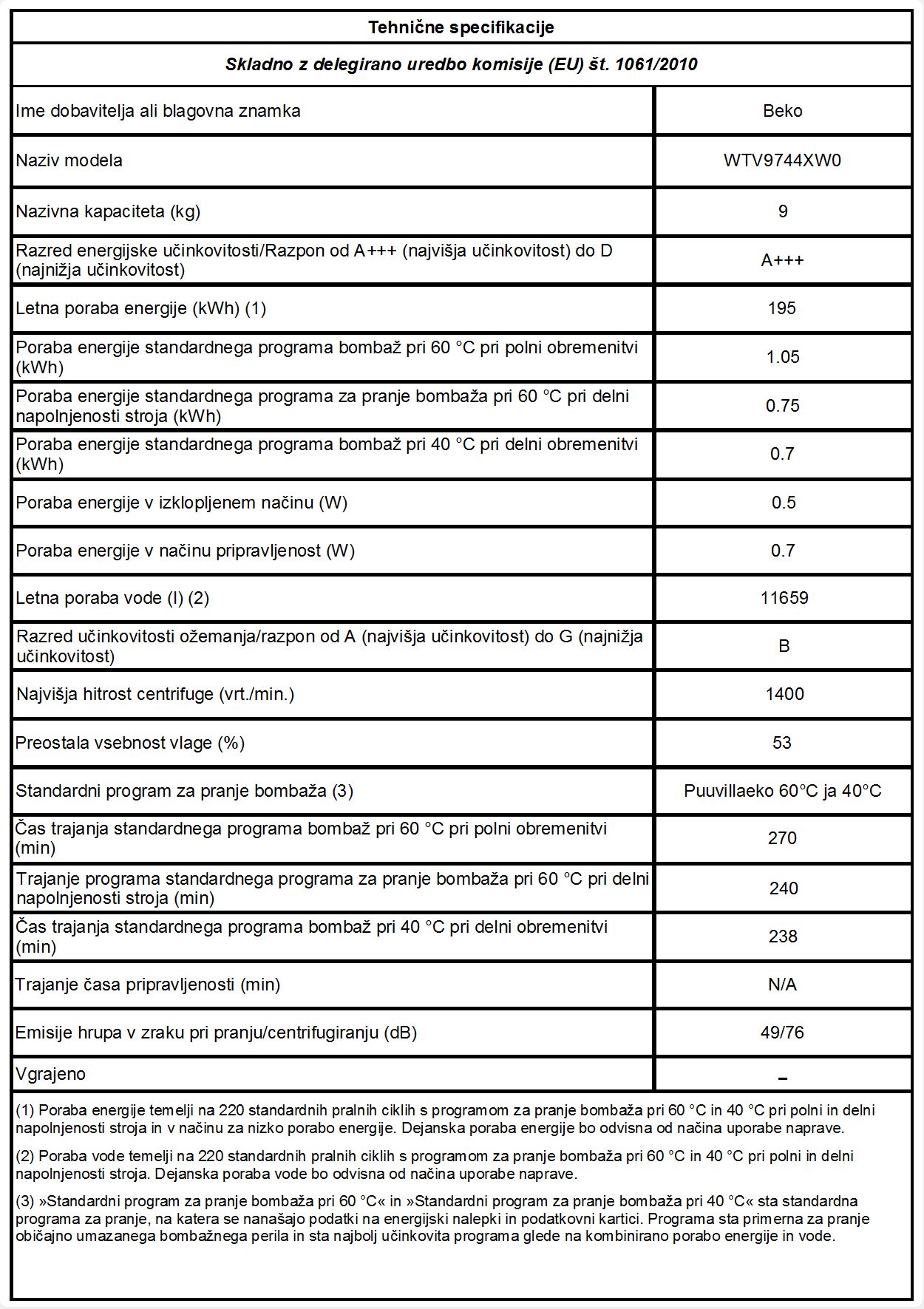 Blagovna znamka BEKO VRSTA PRALNEGA STROJA POLNJENJE SPREDAJ ZMOGLJIVOST PRANJA 9 KG UPRAVLJANJE ELEKTRONSKO ŠIRINA 60 CM VIŠINA 84 CM UČINEK OŽEMANJA B GLOBINA 64 CM LETNA PORABA EL.EN./220 CIKLOV 195 KWH LETNA PORABA VODE / 220 CIKLOV 11659 L HITROST OŽEMANJA DO 1400 O/MIN POVEZLJIVOST WI-FI NE INVERTER MOTOR DA ZAMIK VKLOPA DA ENERGIJSKI RAZRED A+++ PARNA TEHNOLOGIJA NE GLASNOST PRANJA 49 DB GLASNOST OŽEMANJA 76 DB GLOBINA DO 50 CM NE PRIMEREN ZA ALERGIKE NE AQUASTOP TEHNOLOGIJA NE GARANCIJA V LETIH 2 LETI -