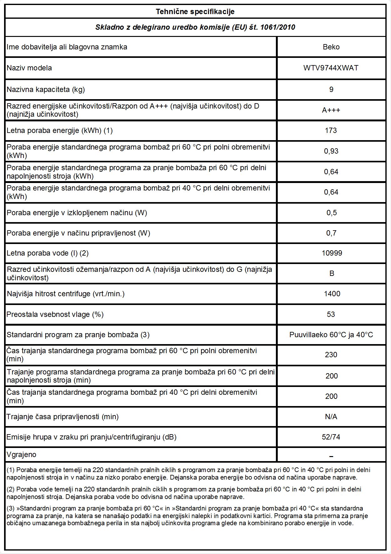 Blagovna znamka BEKO VRSTA PRALNEGA STROJA POLNJENJE SPREDAJ ZMOGLJIVOST PRANJA 9 KG ŠIRINA 60 CM VIŠINA 84 CM GLOBINA 64 CM UČINEK OŽEMANJA B LETNA PORABA EL.EN./220 CIKLOV 173 KWH LETNA PORABA VODE / 220 CIKLOV 10999 L HITROST OŽEMANJA DO 1400 O/MIN UPRAVLJANJE ELEKTRONSKO INVERTER MOTOR DA ZAMIK VKLOPA DA POVEZLJIVOST WI-FI NE ENERGIJSKI RAZRED A+++ PARNA TEHNOLOGIJA NE GLASNOST PRANJA 52 DB GLASNOST OŽEMANJA 74 DB GLOBINA DO 50 CM NE PRIMEREN ZA ALERGIKE NE AQUASTOP TEHNOLOGIJA NE GARANCIJA V LETIH 2 LETI - Mnenja