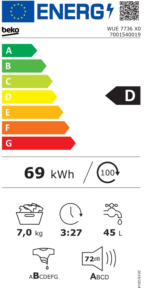 Blagovna znamka BEKO ENERGIJSKI RAZRED D ZMOGLJIVOST PRANJA 7 KG VRSTA PRALNEGA STROJA POLNJENJE SPREDAJ UPRAVLJANJE ELEKTRONSKO PORABA EL. ENERGIJE 100 CIKLOV 69 KWH PORABA VODE NA CIKEL 45 L ENERGIJSKI RAZRED OŽEMANJE B ŠIRINA 60 CM GLOBINA 49 CM HITROST OŽEMANJA DO 1400 O/MIN INVERTER MOTOR DA PARNA TEHNOLOGIJA DA RAZRED EMISIJE HRUPA A ZAMIK VKLOPA DA AQUASTOP TEHNOLOGIJA NE EMISIJA HRUPA - OŽEMANJE 72 DB POVEZLJIVOST WI-FI NE TRAJANJE PROGRAMA ECO 40-60 3:27 H : MIN GLOBINA DO 50 CM DA PRIMEREN ZA ALERGIKE DA VIŠINA 84 CM GARANCIJA V LETIH 2 LETI Mnenja