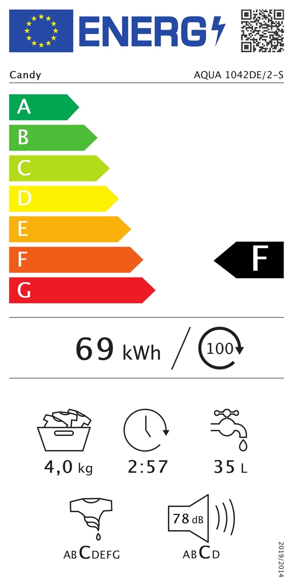 Blagovna znamka CANDY ENERGIJSKI RAZRED F ZMOGLJIVOST PRANJA 4 KG VRSTA PRALNEGA STROJA POLNJENJE SPREDAJ UPRAVLJANJE ELEKTRONSKO PORABA EL. ENERGIJE 100 CIKLOV 69 KWH PORABA VODE NA CIKEL 35 L ENERGIJSKI RAZRED OŽEMANJE C ŠIRINA 51 CM GLOBINA 43,5 CM HITROST OŽEMANJA DO 1000 O/MIN INVERTER MOTOR NE PARNA TEHNOLOGIJA NE RAZRED EMISIJE HRUPA C ZAMIK VKLOPA DA AQUASTOP TEHNOLOGIJA NE EMISIJA HRUPA - OŽEMANJE 78 DB POVEZLJIVOST WI-FI NE TRAJANJE PROGRAMA ECO 40-60 2:57 H : MIN GLOBINA DO 50 CM DA PRIMEREN ZA ALERGIKE NE VIŠINA 70 CM GARANCIJA V LETIH 2 LETI Mnenja