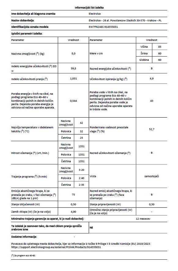 Blagovna znamka ELECTROLUX ENERGIJSKI RAZRED B ZMOGLJIVOST PRANJA 8 KG VRSTA PRALNEGA STROJA POLNJENJE SPREDAJ UPRAVLJANJE ELEKTRONSKO PORABA EL. ENERGIJE 100 CIKLOV 54 KWH PORABA VODE NA CIKEL 43 L ENERGIJSKI RAZRED OŽEMANJE B ŠIRINA 59,7 CM GLOBINA 57,6 CM HITROST OŽEMANJA DO 1400 O/MIN INVERTER MOTOR DA PARNA TEHNOLOGIJA DA RAZRED EMISIJE HRUPA B ZAMIK VKLOPA DA AQUASTOP TEHNOLOGIJA NE EMISIJA HRUPA - OŽEMANJE 75 DB POVEZLJIVOST WI-FI NE TRAJANJE PROGRAMA ECO 40-60 3:20 H : MIN GLOBINA DO 50 CM NE PRIMEREN ZA ALERGIKE NE VIŠINA 84,7 CM GARANCIJA V LETIH 2 DOD.JAMSTVO/POGOJI GARANTA/LET 3 Mnenja