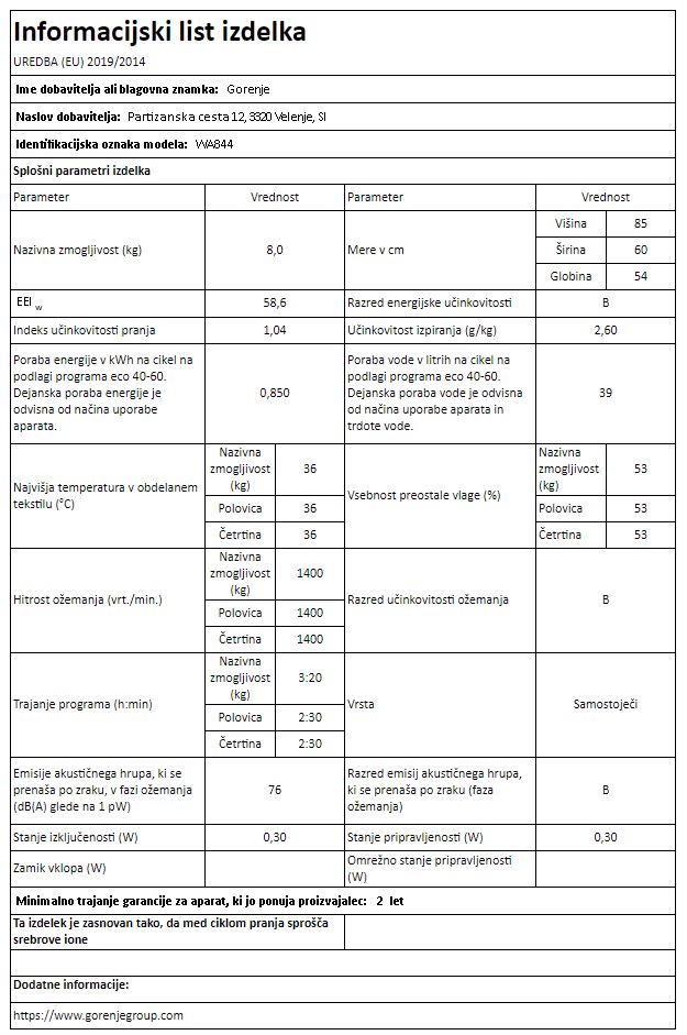 Blagovna znamka GORENJE ENERGIJSKI RAZRED B ZMOGLJIVOST PRANJA 8 KG VRSTA PRALNEGA STROJA POLNJENJE SPREDAJ UPRAVLJANJE ELEKTRONSKO PORABA EL. ENERGIJE 100 CIKLOV 53 KWH PORABA VODE NA CIKEL 39 L ENERGIJSKI RAZRED OŽEMANJE B ŠIRINA 60 CM GLOBINA 54,5 CM HITROST OŽEMANJA DO 1400 O/MIN INVERTER MOTOR DA PARNA TEHNOLOGIJA NE RAZRED EMISIJE HRUPA B ZAMIK VKLOPA DA AQUASTOP TEHNOLOGIJA NE EMISIJA HRUPA - OŽEMANJE 76 DB POVEZLJIVOST WI-FI NE TRAJANJE PROGRAMA ECO 40-60 3:20 H : MIN GLOBINA DO 50 CM NE PRIMEREN ZA ALERGIKE DA VIŠINA 85 CM GARANCIJA V LETIH 2+3 LETA Mnenja