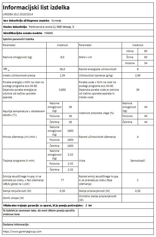 Blagovna znamka GORENJE ENERGIJSKI RAZRED B ZMOGLJIVOST PRANJA 8 KG VRSTA PRALNEGA STROJA POLNJENJE SPREDAJ UPRAVLJANJE ELEKTRONSKO PORABA EL. ENERGIJE 100 CIKLOV 53 KWH PORABA VODE NA CIKEL 39 L ENERGIJSKI RAZRED OŽEMANJE A ŠIRINA 60 CM GLOBINA 54,5 CM HITROST OŽEMANJA DO 1600 O/MIN INVERTER MOTOR DA PARNA TEHNOLOGIJA NE RAZRED EMISIJE HRUPA C ZAMIK VKLOPA DA AQUASTOP TEHNOLOGIJA NE EMISIJA HRUPA - OŽEMANJE 77 DB POVEZLJIVOST WI-FI NE TRAJANJE PROGRAMA ECO 40-60 3:20 H : MIN GLOBINA DO 50 CM NE PRIMEREN ZA ALERGIKE DA VIŠINA 85 CM GARANCIJA V LETIH 5 LET Mnenja