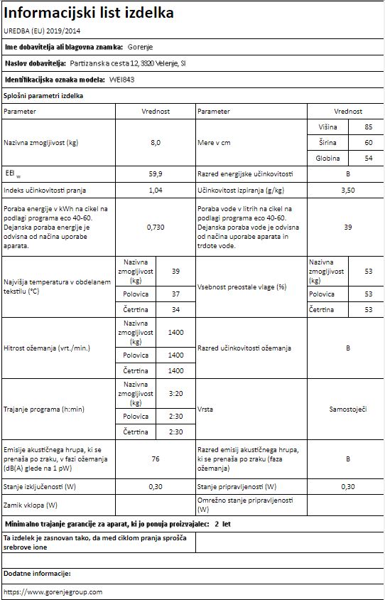 Blagovna znamka GORENJE ENERGIJSKI RAZRED B ZMOGLJIVOST PRANJA 8 KG VRSTA PRALNEGA STROJA POLNJENJE SPREDAJ UPRAVLJANJE ELEKTRONSKO PORABA EL. ENERGIJE 100 CIKLOV 54 KWH PORABA VODE NA CIKEL 39 L ENERGIJSKI RAZRED OŽEMANJE B ŠIRINA 60 CM GLOBINA 54,5 CM HITROST OŽEMANJA DO 1400 O/MIN INVERTER MOTOR DA PARNA TEHNOLOGIJA NE RAZRED EMISIJE HRUPA B ZAMIK VKLOPA DA AQUASTOP TEHNOLOGIJA NE EMISIJA HRUPA - OŽEMANJE 76 DB POVEZLJIVOST WI-FI NE TRAJANJE PROGRAMA ECO 40-60 3:20 H : MIN GLOBINA DO 50 CM NE PRIMEREN ZA ALERGIKE DA VIŠINA 85 CM GARANCIJA V LETIH 2+3 LETA Mnenja