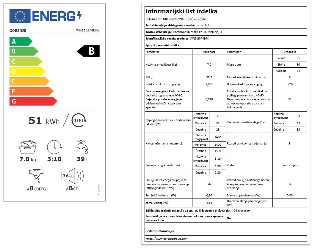 Blagovna znamka GORENJE ENERGIJSKI RAZRED A ZMOGLJIVOST PRANJA 7 KG VRSTA PRALNEGA STROJA POLNJENJE SPREDAJ UPRAVLJANJE ELEKTRONSKO PORABA EL. ENERGIJE 100 CIKLOV 45 KWH PORABA VODE NA CIKEL 45 L ENERGIJSKI RAZRED OŽEMANJE B ŠIRINA 60 CM GLOBINA 54,5 CM HITROST OŽEMANJA DO 1400 O/MIN INVERTER MOTOR DA PARNA TEHNOLOGIJA DA RAZRED EMISIJE HRUPA B ZAMIK VKLOPA DA AQUASTOP TEHNOLOGIJA NE EMISIJA HRUPA - OŽEMANJE 76 DB POVEZLJIVOST WI-FI NE TRAJANJE PROGRAMA ECO 40-60 3:01 H : MIN GLOBINA DO 50 CM NE PRIMEREN ZA ALERGIKE NE VIŠINA 85 CM GARANCIJA V LETIH 2+3 LETA Mnenja