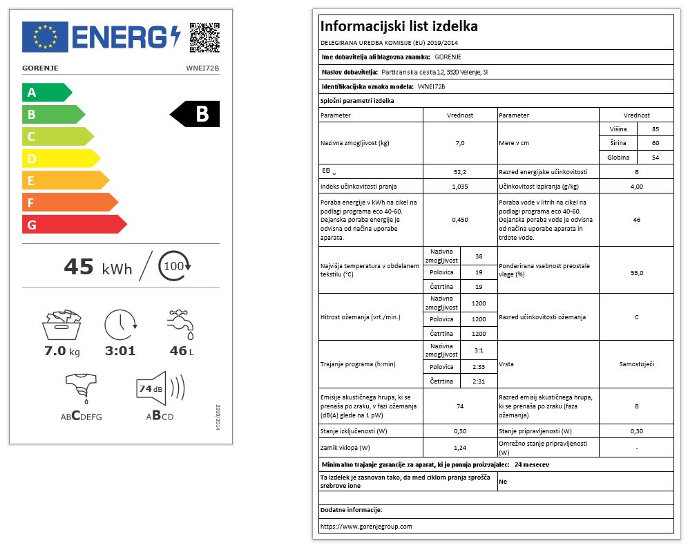 Blagovna znamka GORENJE ENERGIJSKI RAZRED B ZMOGLJIVOST PRANJA 7 KG VRSTA PRALNEGA STROJA POLNJENJE SPREDAJ UPRAVLJANJE ELEKTRONSKO PORABA EL. ENERGIJE 100 CIKLOV 45 KWH PORABA VODE NA CIKEL 46 L ENERGIJSKI RAZRED OŽEMANJE C ŠIRINA 60 CM GLOBINA 54,5 CM HITROST OŽEMANJA DO 1200 O/MIN INVERTER MOTOR DA PARNA TEHNOLOGIJA NE RAZRED EMISIJE HRUPA B ZAMIK VKLOPA DA AQUASTOP TEHNOLOGIJA NE EMISIJA HRUPA - OŽEMANJE 74 DB POVEZLJIVOST WI-FI NE TRAJANJE PROGRAMA ECO 40-60 3:01 H : MIN GLOBINA DO 50 CM NE PRIMEREN ZA ALERGIKE NE VIŠINA 85 CM GARANCIJA V LETIH 2 DOD.JAMSTVO/POGOJI GARANTA/LET 3 Mnenja