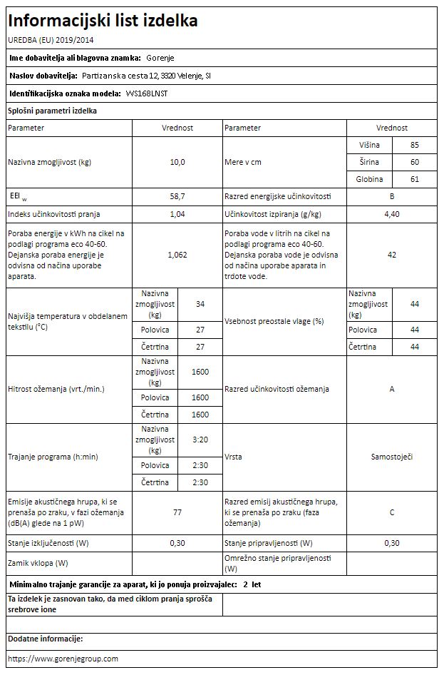 Blagovna znamka GORENJE ENERGIJSKI RAZRED B ZMOGLJIVOST PRANJA 10 KG VRSTA PRALNEGA STROJA POLNJENJE SPREDAJ UPRAVLJANJE ELEKTRONSKO PORABA EL. ENERGIJE 100 CIKLOV 58 KWH PORABA VODE NA CIKEL 42 L ENERGIJSKI RAZRED OŽEMANJE A ŠIRINA 60 CM GLOBINA 61 CM HITROST OŽEMANJA DO 1600 O/MIN INVERTER MOTOR DA PARNA TEHNOLOGIJA NE RAZRED EMISIJE HRUPA C ZAMIK VKLOPA DA AQUASTOP TEHNOLOGIJA NE EMISIJA HRUPA - OŽEMANJE 77 DB POVEZLJIVOST WI-FI NE TRAJANJE PROGRAMA ECO 40-60 3:20 H : MIN GLOBINA DO 50 CM NE PRIMEREN ZA ALERGIKE DA VIŠINA 85 CM GARANCIJA V LETIH 2+3 LETA Mnenja