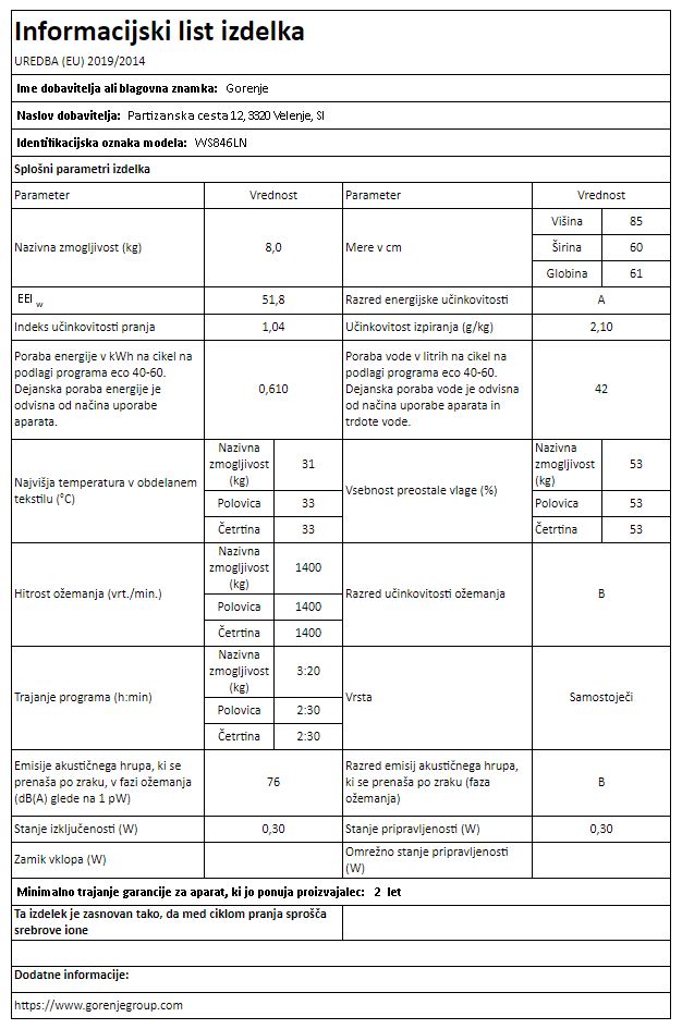 PRALNI STROJ GORENJE WS846LN