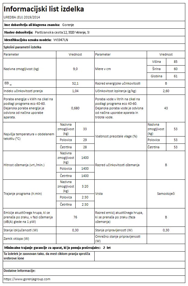 Blagovna znamka GORENJE ENERGIJSKI RAZRED B ZMOGLJIVOST PRANJA 9 KG VRSTA PRALNEGA STROJA POLNJENJE SPREDAJ UPRAVLJANJE ELEKTRONSKO PORABA EL. ENERGIJE 100 CIKLOV 50 KWH PORABA VODE NA CIKEL 43 L ENERGIJSKI RAZRED OŽEMANJE B ŠIRINA 60 CM GLOBINA 61 CM HITROST OŽEMANJA DO 1400 O/MIN INVERTER MOTOR DA PARNA TEHNOLOGIJA NE RAZRED EMISIJE HRUPA B ZAMIK VKLOPA DA AQUASTOP TEHNOLOGIJA NE EMISIJA HRUPA - OŽEMANJE 76 DB POVEZLJIVOST WI-FI NE TRAJANJE PROGRAMA ECO 40-60 3:20 H : MIN GLOBINA DO 50 CM NE PRIMEREN ZA ALERGIKE DA VIŠINA 85 CM GARANCIJA V LETIH 2+3 LETA Mnenja
