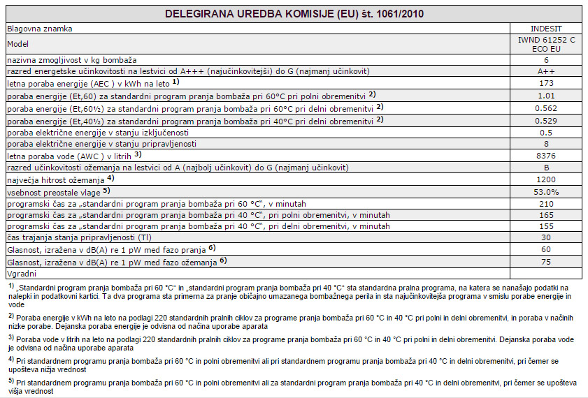 Indesit pralni stroj s sprednjim polnjenjem sodi v visok energijski razred A++. Odlikujejo ga visoka zmogljivost pranja perila do 6 kg, možnost hitrosti centrifuge do 1.200 vrtljajev na minuto, velik digitalni prikazovalnik ter 16 različnih programov pranja. Pralni stroj je prav tako zaščiten pred možnostjo izlitja vode. Celotna teža pralnega stroja znaša 66,5 kg.