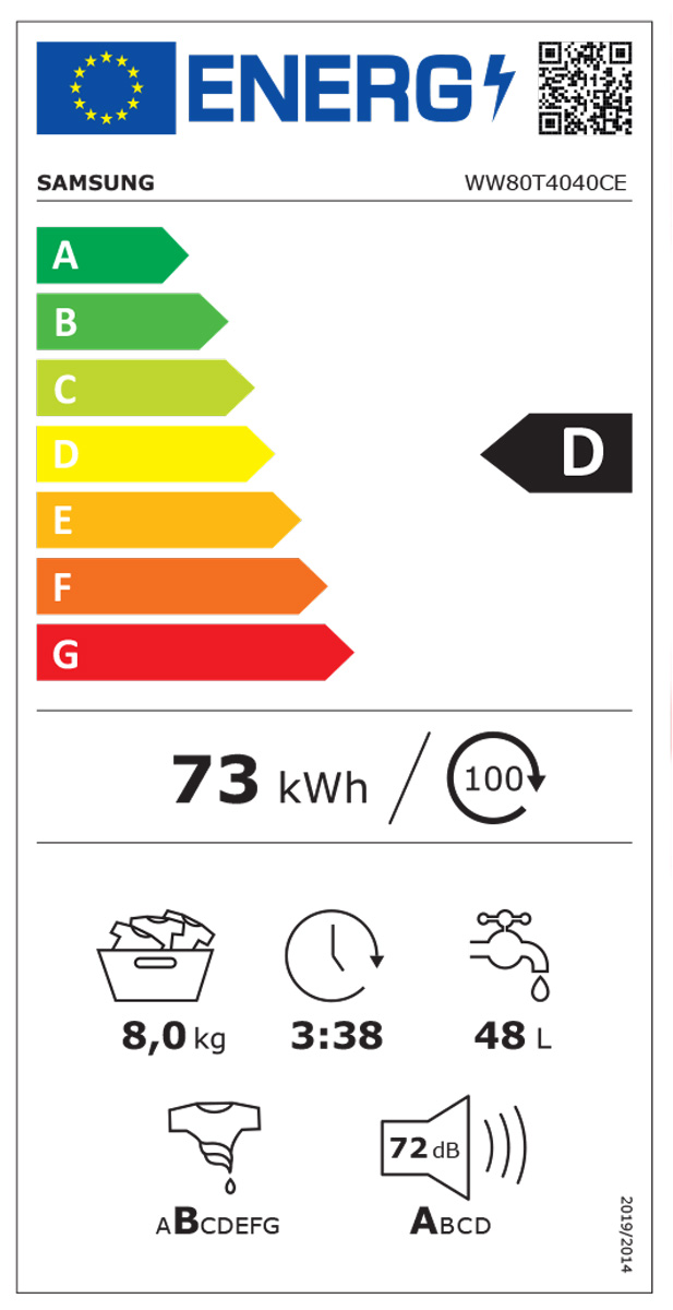 Blagovna znamka SAMSUNG ENERGIJSKI RAZRED D ZMOGLJIVOST PRANJA 8 KG VRSTA PRALNEGA STROJA POLNJENJE SPREDAJ UPRAVLJANJE ELEKTRONSKO PORABA EL. ENERGIJE 100 CIKLOV 73 KWH PORABA VODE NA CIKEL 48 L ENERGIJSKI RAZRED OŽEMANJE B ŠIRINA 60 CM GLOBINA 55 CM HITROST OŽEMANJA DO 1400 O/MIN INVERTER MOTOR DA PARNA TEHNOLOGIJA NE RAZRED EMISIJE HRUPA A ZAMIK VKLOPA DA AQUASTOP TEHNOLOGIJA NE EMISIJA HRUPA - OŽEMANJE 72 DB POVEZLJIVOST WI-FI NE TRAJANJE PROGRAMA ECO 40-60 3:38 H : MIN GLOBINA DO 50 CM NE PRIMEREN ZA ALERGIKE NE VIŠINA 85 CM GARANCIJA V LETIH 2 DOD.JAMSTVO/POGOJI GARANTA/LET 3 Mnenja