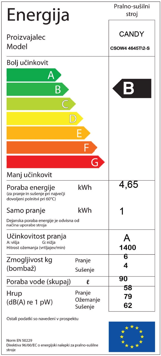 Blagovna znamka CANDY ENERGIJSKI RAZRED B ZMOGLJIVOST PRANJA 6 KG ZMOGLJIVOST SUŠENJA 4 KG ŠIRINA 60 CM GLOBINA 45 CM HITROST OŽEMANJA DO 1400 O/MIN INVERTER MOTOR NE ZAMIK VKLOPA DA AQUASTOP TEHNOLOGIJA NE NAČIN POLNJENJA POLNJENJE SPREDAJ POVEZLJIVOST WI-FI NE UČINEK PRANJA A UČINEK OŽEMANJA B PORABA ENERG.PRANJE IN SUŠENJE 4,65 KWH PORABA ENERGIJE ZA PRANJE 1 KWH GLASNOST PRANJA 58 DB GLASNOST OŽEMANJA 79 DB PORABA VODE 90 L GLOBINA DO 50 CM DA PRIMEREN ZA ALERGIKE NE VIŠINA 85 CM GARANCIJA V LETIH 2 LETI Mnenja