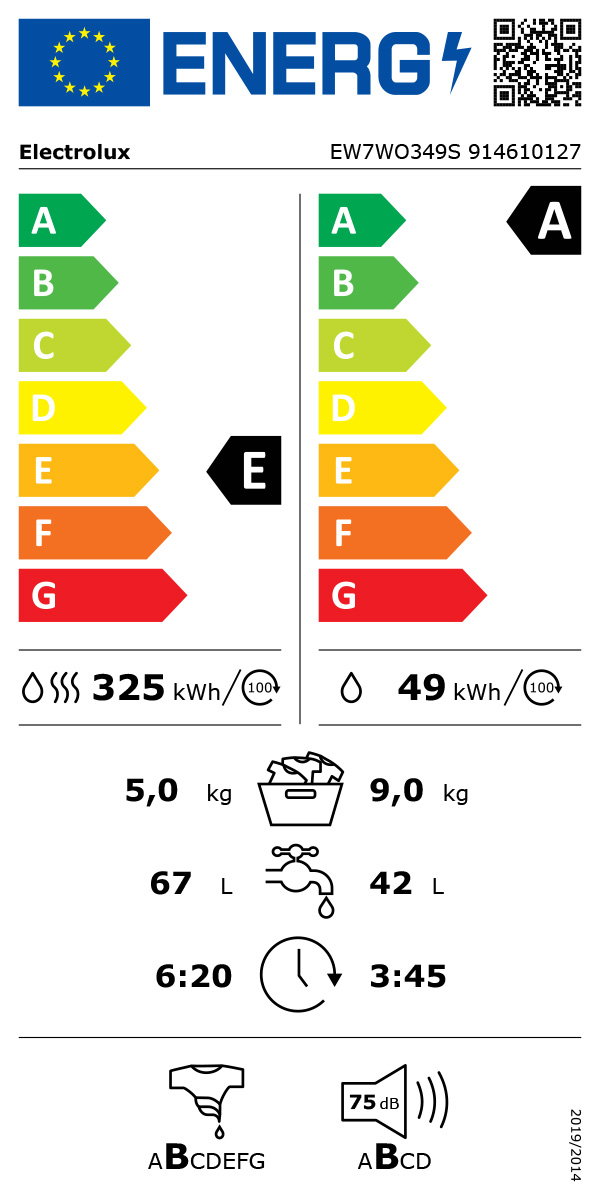 Blagovna znamka ELECTROLUX ZMOGLJIVOST PRANJA 9 KG ZMOGLJIVOST CELOTNI CIKEL 5 KG ENERG. RAZRED CELOTNI CIKEL E ENERGIJSKI RAZRED CIKEL PRANJA A ZMOGLJIVOST SUŠENJA 5 KG ENERGIJSKI RAZRED OŽEMANJE B ŠIRINA 60 CM PORABA ENERGIJE CELOTNI CIKEL 325 KWH/100 CIKLOV PORABA ENERGIJE CIKEL PRANJA 49 KWH/100 CIKLOV GLOBINA 57 CM HITROST OŽEMANJA DO 1400 O/MIN INVERTER MOTOR NE TRAJANJE PROG. CELOTNI CIKEL 6:20 H : MIN TRAJANJE PROGRAMA CIKEL PRANJA 3:45 H : MIN RAZRED EMISIJE HRUPA B ZAMIK VKLOPA DA AQUASTOP TEHNOLOGIJA NE NAČIN POLNJENJA POLNJENJE SPREDAJ EMISIJA HRUPA CIKL OŽEMANJA 75 DB POVEZLJIVOST WI-FI NE PORABA VODE CELOTNI CIKEL 67 L PORABA VODE CIKEL PRANJA 42 L GLOBINA DO 50 CM NE PRIMEREN ZA ALERGIKE NE VIŠINA 85 CM GARANCIJA V LETIH 2 DOD.JAMSTVO/POGOJI GARANTA/LET 3 Mnenja