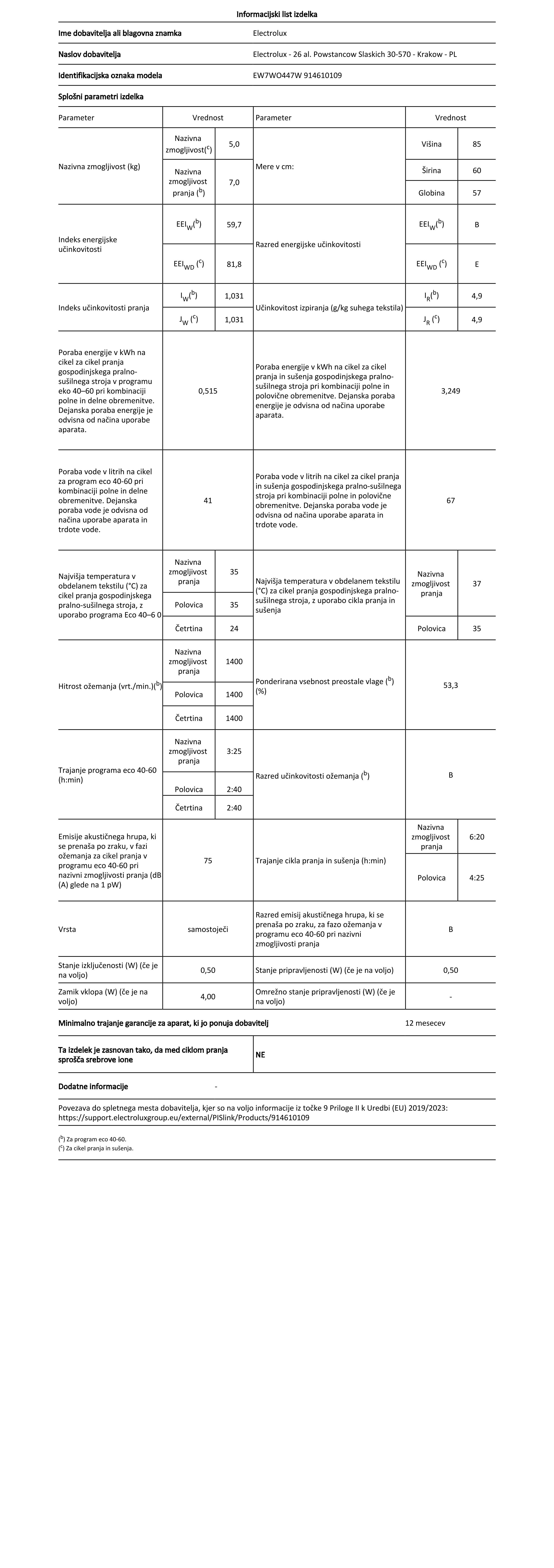 Blagovna znamka ELECTROLUX ZMOGLJIVOST PRANJA 7 KG ZMOGLJIVOST CELOTNI CIKEL 5 KG ENERG. RAZRED CELOTNI CIKEL E ENERGIJSKI RAZRED CIKEL PRANJA B ZMOGLJIVOST SUŠENJA 5 KG ENERGIJSKI RAZRED OŽEMANJE B ŠIRINA 59,7 CM PORABA ENERGIJE CELOTNI CIKEL 325 KWH/100 CIKLOV PORABA ENERGIJE CIKEL PRANJA 52 KWH/100 CIKLOV GLOBINA 55,1 CM HITROST OŽEMANJA DO 1400 O/MIN INVERTER MOTOR NE BARVA BELA TRAJANJE PROG. CELOTNI CIKEL 3:25 H : MIN TRAJANJE PROGRAMA CIKEL PRANJA 6:20 H : MIN RAZRED EMISIJE HRUPA B ZAMIK VKLOPA DA AQUASTOP TEHNOLOGIJA NE NAČIN POLNJENJA POLNJENJE SPREDAJ EMISIJA HRUPA CIKL OŽEMANJA 75 DB PORABA VODE CELOTNI CIKEL 67 L PORABA VODE CIKEL PRANJA 41 L PORABA ENERGIJE ZA PRANJE 52 KWH PORABA VODE 67 L GLOBINA DO 50 CM NE PRIMEREN ZA ALERGIKE DA DODATNO - PRALNO SUŠILNI STROJ KG DETEKTOR PRANJE S PARO SENZOR TEŽE ZAŠČITA PRED VIŠINA 84,7 CM GARANCIJA V LETIH 2 LETI Mnenja