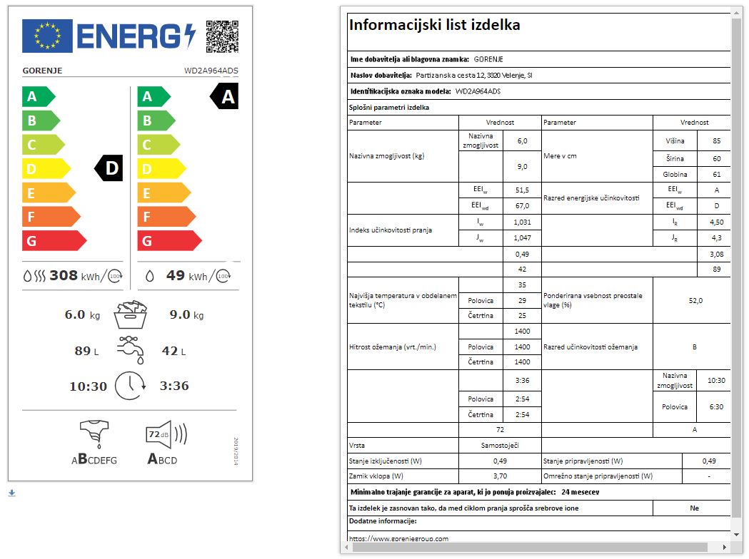 Pralno-sušilni stroj Gorenje WD2A964ADS se uvršča v energijski razred pranja A in ima zmogljivost pranja do 9 kg. Spada v energijski razred sušenja D, z zmogljivostjo do 6 kg. Nudi sprednje polnjenje z velikimi vrati z dvojno zasteklitvijo. Otroška varnostna ključavnica poskrbi, da ne bi radovedne roke spreminjale nastavitve pranja in sušenja. Za varno pranje poskrbi zaščita pred prelivom. Z vrtljivim gumbom in tipkami na dotik omogoča enostavno upravljanje, z možnostjo dodatnega prilagajanja petnajstih programov. Ponaša se s funkcijo DelayEnd in s tridelno dozirno posodo. Odlikuje ga parna tehnologija SteamTech, ki zrahlja perilo in zmanjša gube, zaradi česar je likanje lažje, ali celo nepotrebno.Tehnične podrobnosti