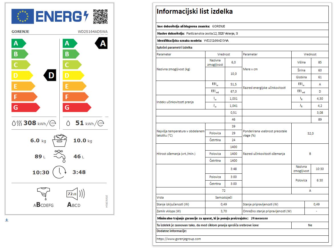 Blagovna znamka GORENJE ZMOGLJIVOST PRANJA 10 KG ZMOGLJIVOST CELOTNI CIKEL 5 KG ENERG. RAZRED CELOTNI CIKEL D ENERGIJSKI RAZRED CIKEL PRANJA A ZMOGLJIVOST SUŠENJA 5 KG ENERGIJSKI RAZRED OŽEMANJE B ŠIRINA 60 CM PORABA ENERGIJE CELOTNI CIKEL 308 KWH/100 CIKLOV PORABA ENERGIJE CIKEL PRANJA 51 KWH/100 CIKLOV GLOBINA 67 CM HITROST OŽEMANJA DO 1400 O/MIN INVERTER MOTOR DA TRAJANJE PROG. CELOTNI CIKEL 10:30 H : MIN TRAJANJE PROGRAMA CIKEL PRANJA 3:48 H : MIN RAZRED EMISIJE HRUPA A ZAMIK VKLOPA DA AQUASTOP TEHNOLOGIJA NE NAČIN POLNJENJA POLNJENJE SPREDAJ EMISIJA HRUPA CIKL OŽEMANJA 72 DB POVEZLJIVOST WI-FI NE PORABA VODE CELOTNI CIKEL 80 L PORABA VODE CIKEL PRANJA 46 L GLOBINA DO 50 CM NE PRIMEREN ZA ALERGIKE NE VIŠINA 85 CM GARANCIJA V LETIH 2 DOD.JAMSTVO/POGOJI GARANTA/LET 3 Mnenja