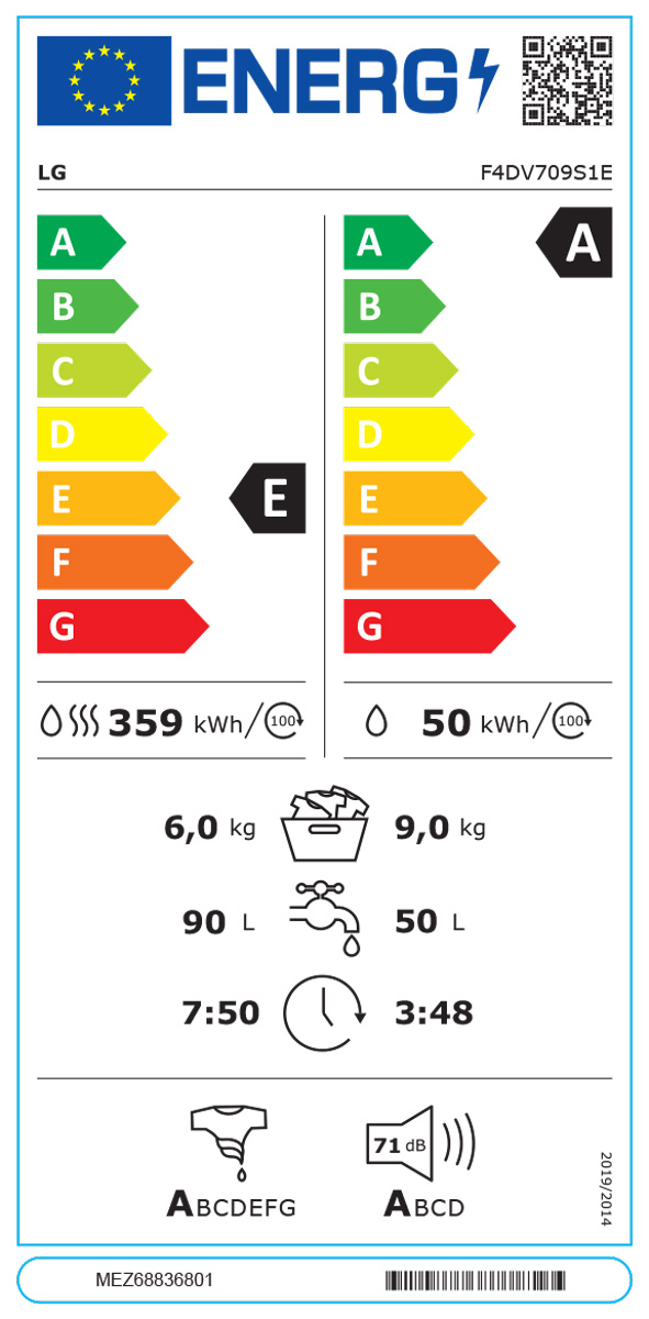 Blagovna znamka LG ZMOGLJIVOST PRANJA 9 KG ZMOGLJIVOST CELOTNI CIKEL 6 KG UPRAVLJANJE DISPLAY S PRIKAZOM SIMBOLOM ELEKTRONSKO Z GUMBI ENERG. RAZRED CELOTNI CIKEL E ENERGIJSKI RAZRED CIKEL PRANJA A ZMOGLJIVOST SUŠENJA 6 KG ENERGIJSKI RAZRED OŽEMANJE A ŠIRINA 60 CM PORABA ENERGIJE CELOTNI CIKEL 359 KWH/100 CIKLOV PORABA ENERGIJE CIKEL PRANJA 50 KWH/100 CIKLOV GLOBINA 56,5 CM HITROST OŽEMANJA DO 1400 O/MIN INVERTER MOTOR DA TRAJANJE PROG. CELOTNI CIKEL 7:50 H : MIN TRAJANJE PROGRAMA CIKEL PRANJA 3:48 H : MIN RAZRED EMISIJE HRUPA A ZAMIK VKLOPA DA AQUASTOP TEHNOLOGIJA NE NAČIN POLNJENJA POLNJENJE SPREDAJ EMISIJA HRUPA CIKL OŽEMANJA 71 DB POVEZLJIVOST WI-FI DA PORABA VODE CELOTNI CIKEL 90 L PORABA VODE CIKEL PRANJA 50 L DIREKT DRIVE MOTOR DA GLOBINA DO 50 CM NE PRIMEREN ZA ALERGIKE DA VIŠINA 85 CM GARANCIJA V LETIH 2 LETI DOD.JAMSTVO/POGOJI GARANTA/LET 3 LETA Mnenja