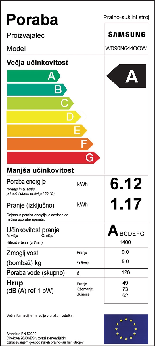 Blagovna znamka SAMSUNG ENERGIJSKI RAZRED A ZMOGLJIVOST PRANJA 9 KG ZMOGLJIVOST SUŠENJA 5 KG ŠIRINA 60 CM GLOBINA 60 CM HITROST OŽEMANJA DO 1400 O/MIN INVERTER MOTOR DA ZAMIK VKLOPA DA AQUASTOP TEHNOLOGIJA NE NAČIN POLNJENJA POLNJENJE SPREDAJ POVEZLJIVOST WI-FI DA UČINEK PRANJA A UČINEK OŽEMANJA A PORABA ENERG.PRANJE IN SUŠENJE 6,12 KWH PORABA ENERGIJE ZA PRANJE 1,17 KWH GLASNOST PRANJA 49 DB GLASNOST OŽEMANJA 73 DB PORABA VODE 126 L GLOBINA DO 50 CM NE PRIMEREN ZA ALERGIKE NE VIŠINA 85 CM GARANCIJA V LETIH 2 LETI Mnenja
