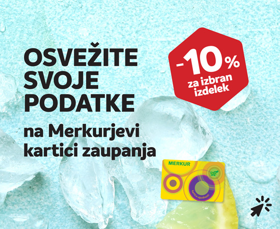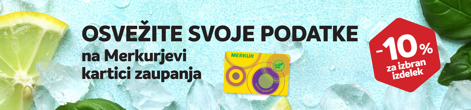 * Kupon velja 1 mesec od dneva pridobitve in velja na en izdelek oz. eno pakiranje po vaši izbiri ob predložitvi Merkurjeve kartice zaupanja. Kupon velja za en izdelek po redni ceni in ne velja za izdelek vključen v drugo akcijo. Akcije in kuponi se ne seštevajo oz. se med seboj izključujejo. Popust velja samo za trgovsko blago in ne velja za storitve, pri nakupu hiš Ytong in izdekov blagovnih znamk Dyson, Intex, Miele, Liebherr, iRobot, Electrolux bela tehnika, vgradnih bazenov, tobačnih izdelkov, mobilnih in darilnih kartic Merkur. Ne velja pri nakupu v Spletnem centru MERKUR ter ni unovčljiv v franšiznih prodajalnah.
